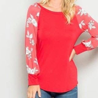 Coral raglan top with white floral sleeves.