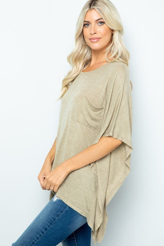 SOLID KNIT ROUND NECK BOXY PONCHO TOP WITH FRONT POCKET.